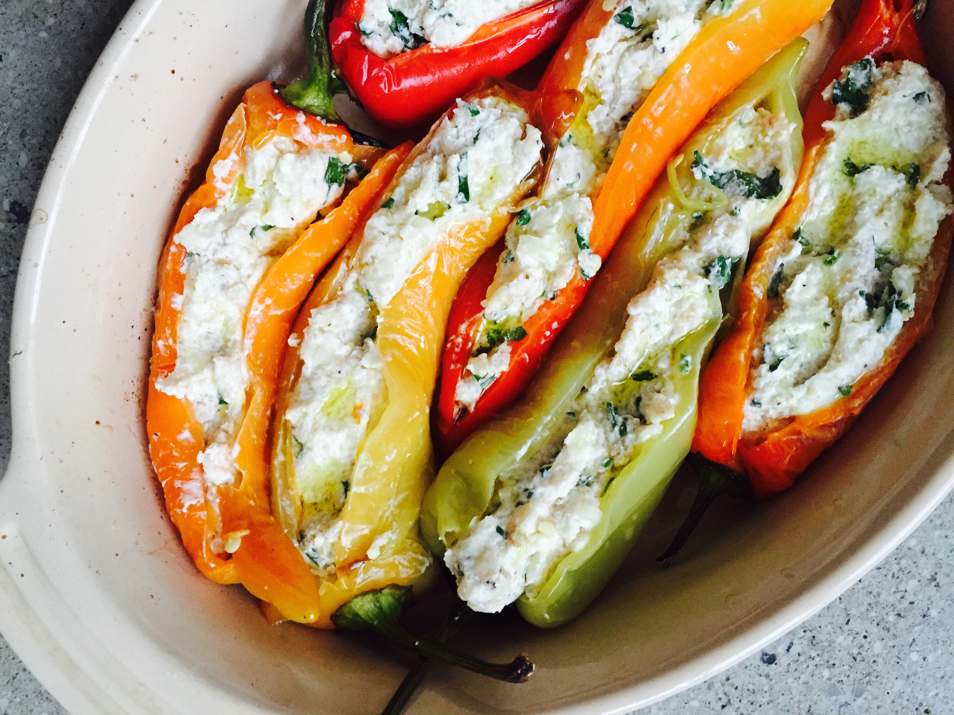 - Stuff the peppers with the cheese mixture and bake in an oven-safe casserole dish, covered with foil, about 30 minutes.